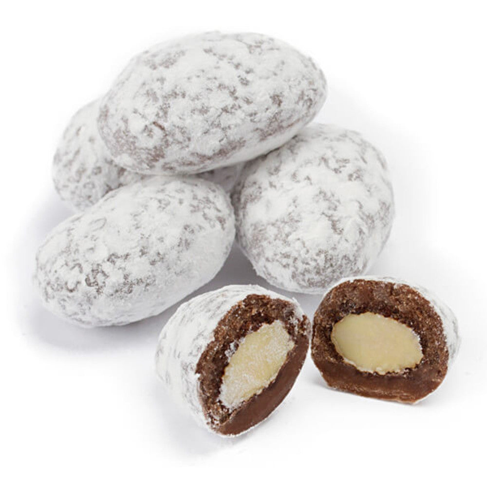 Almondolas are almonds dipped in milk chocolate, then rolled in a cinnamon hazelnut paste, then dusted with powdered sugar.