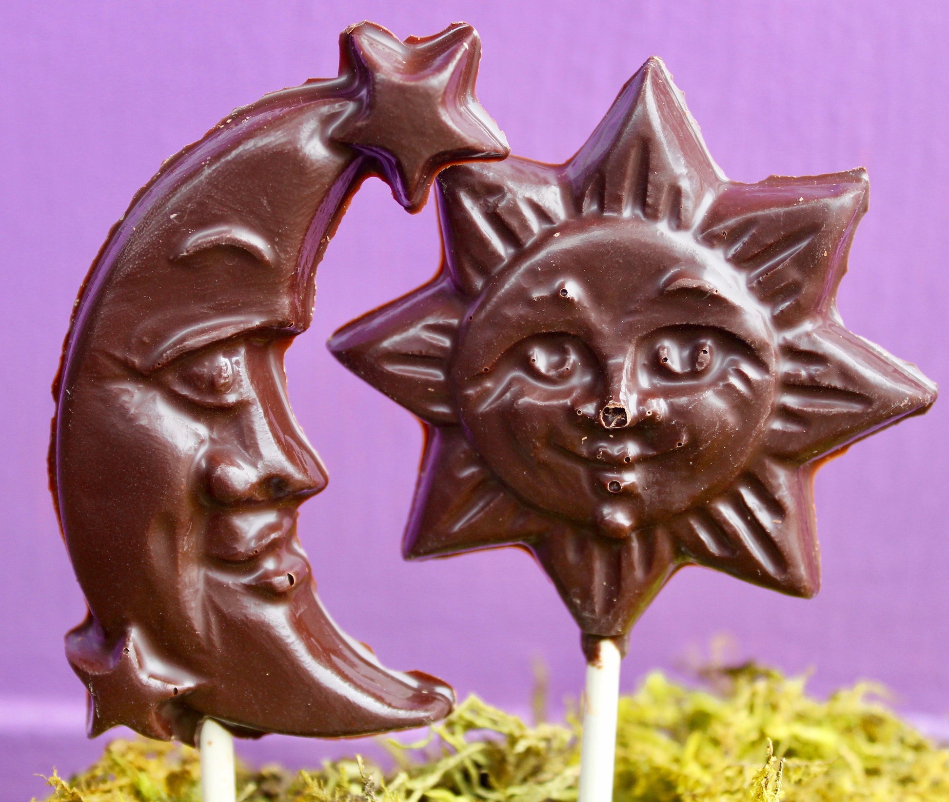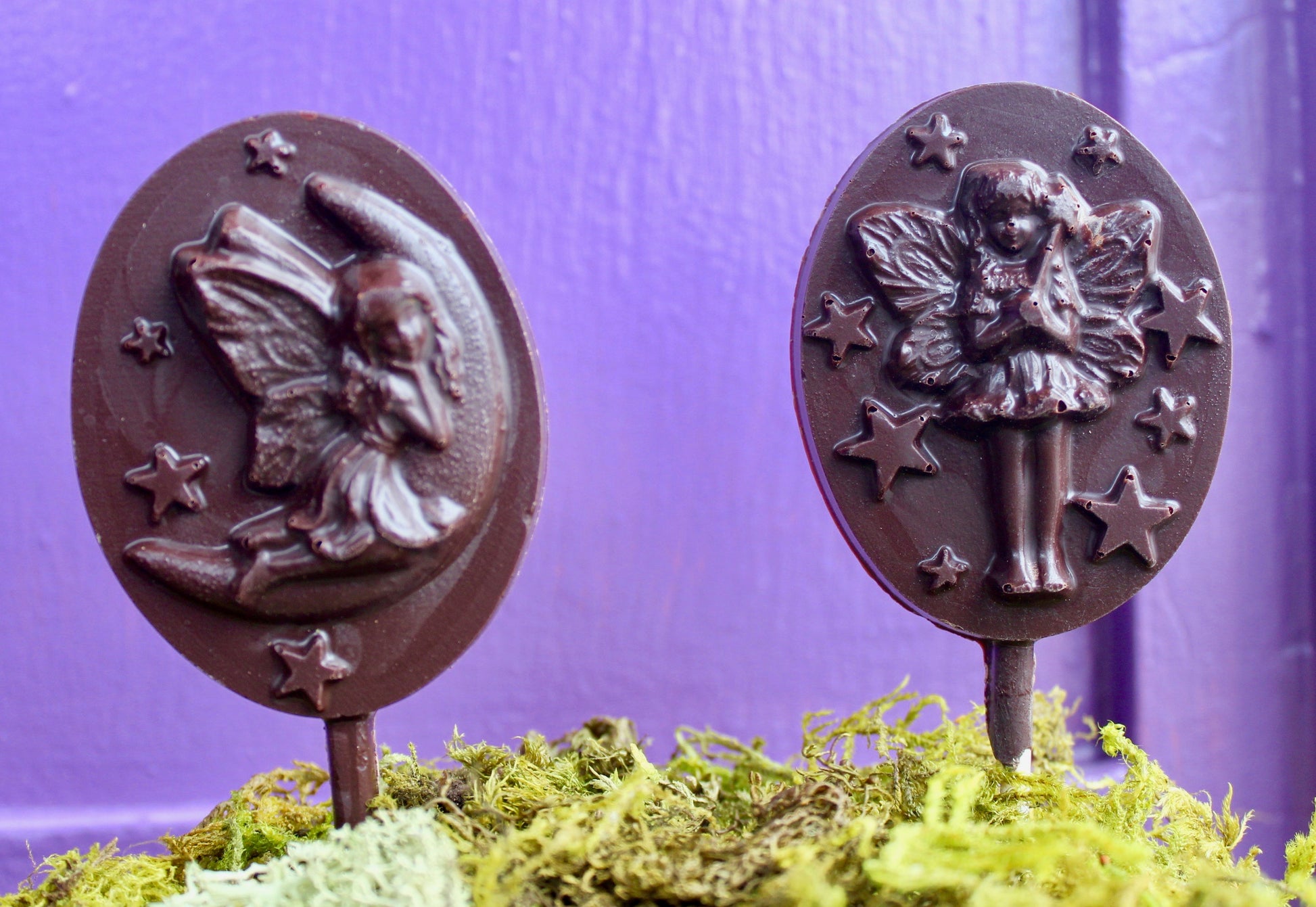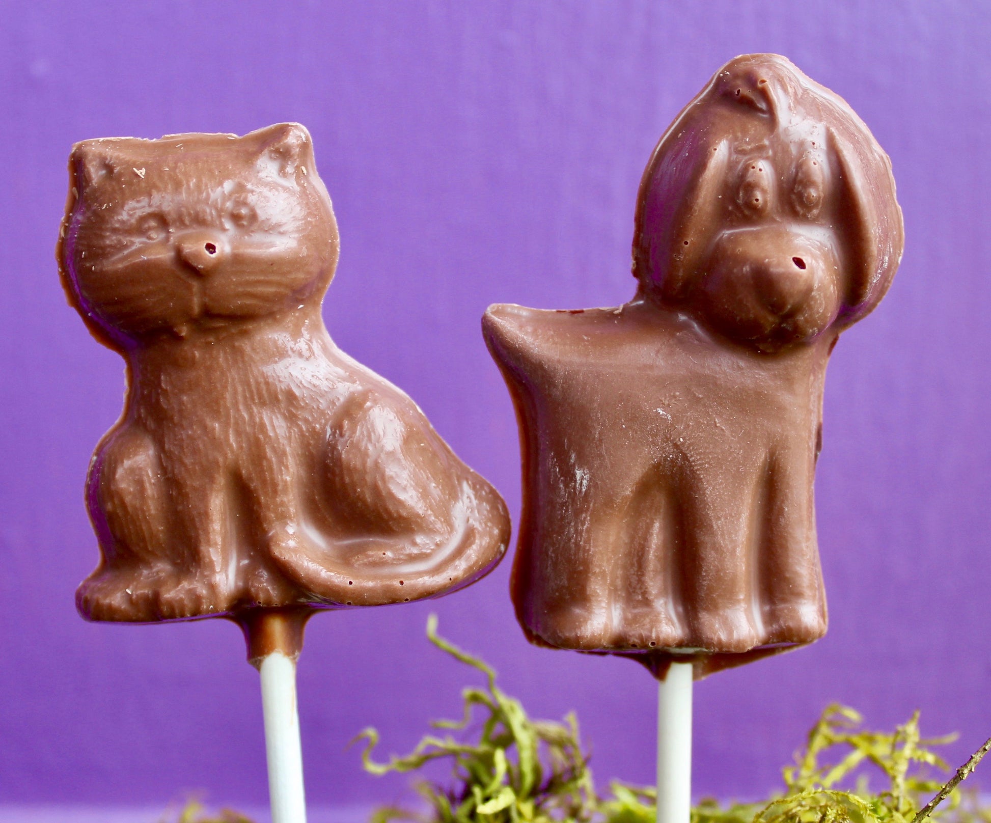 Solid chocolate novelty lollipops, made here in the shop using our signature couverture Belgian chocolate. Dark chocolate is dairy free.