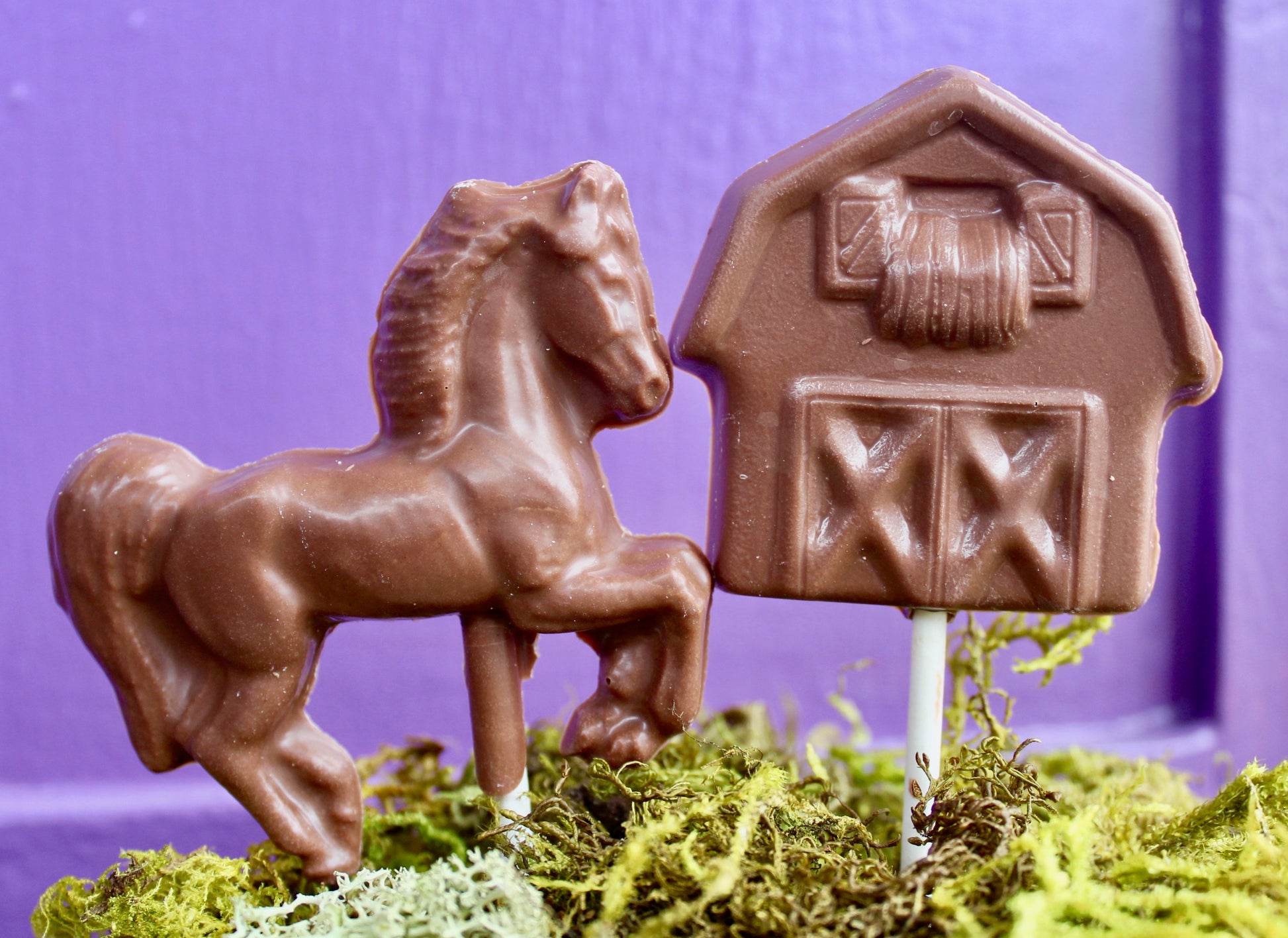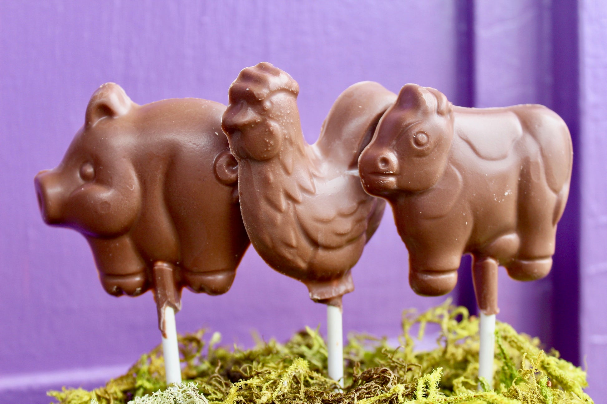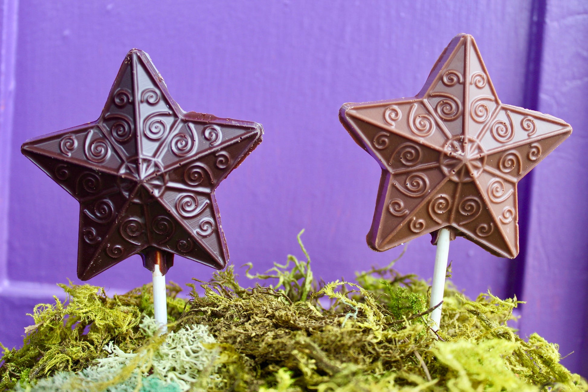 Solid chocolate novelty lollipops, made here in the shop using our signature couverture Belgian chocolate. Dark chocolate is dairy free.