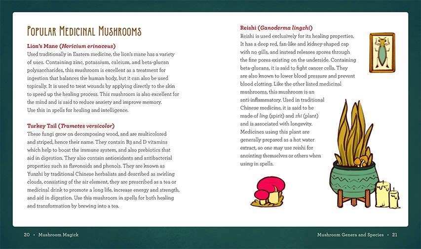 A fascinating and enlightening celebration of mushrooms and the magic of the forest for those who revel in mushroom imagery and lore. Mushrooms—as a decorative element, as a signifier of the mystery of the forest, and as an adorable emblem of witchy cottagecore dreams—have proliferated in the collective consciousness as of late. Mushroom Magick is a whimsical collection of mushroom facts and fables divided into three sections: first, profiles of 22 well-known mushrooms include information on biology and common uses as well as a rundown of their energetic properties and suggestions for incorporating them into spellwork. Section two provides a world-spanning collection of mushroom myths and fables. The final section includes spells and rituals that you can perform with common mushrooms such as creminis, shiitakes, and portobellos—carved candles, teas, and even some yummy meals can improve your love life or super-charge your good fortune. Hardcover; 5.5 x 6.5 inches; 128 pages.