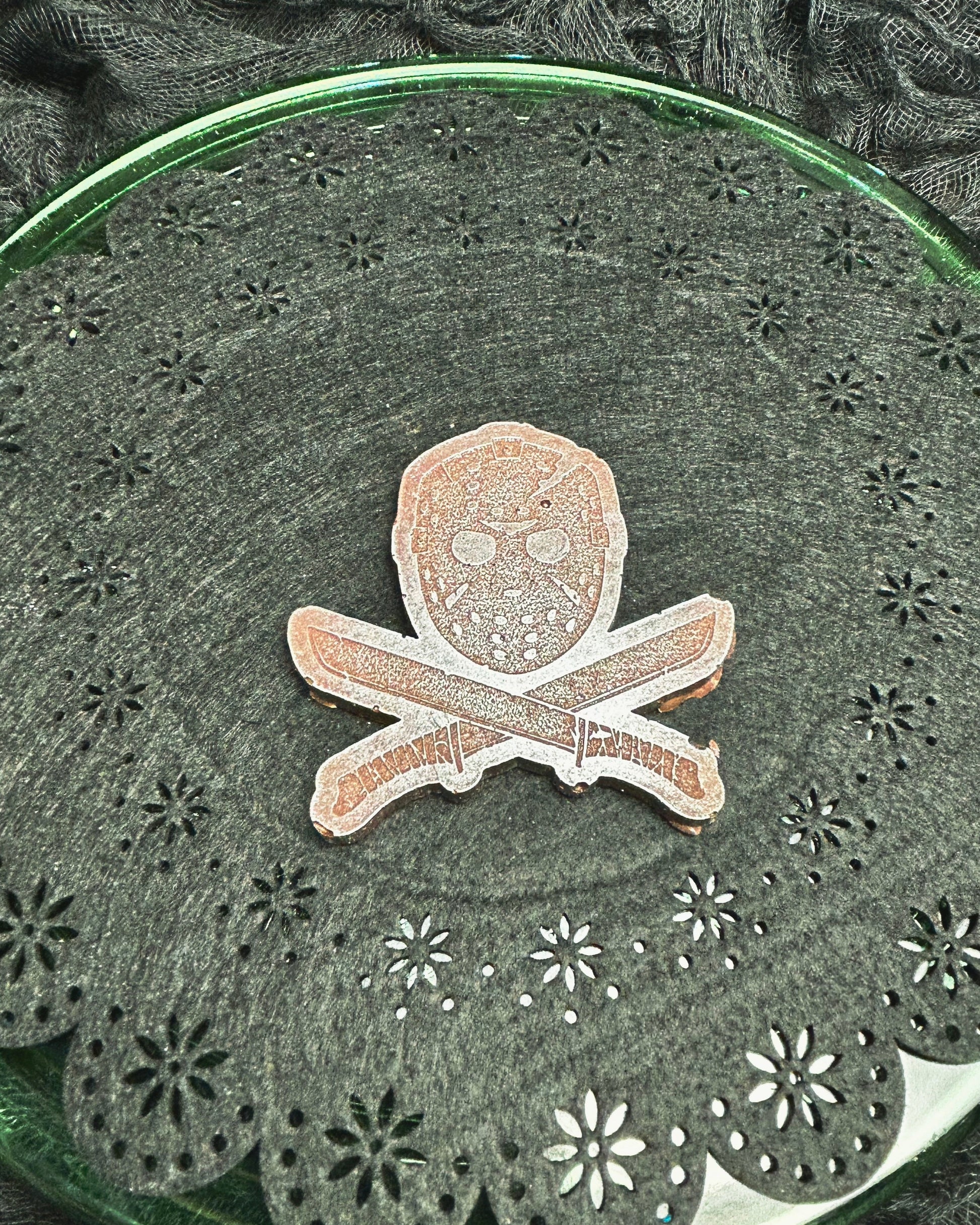 This solid chocolate Jason mask and machetes is made with pure Belgian couverture chocolate and individually packaged.