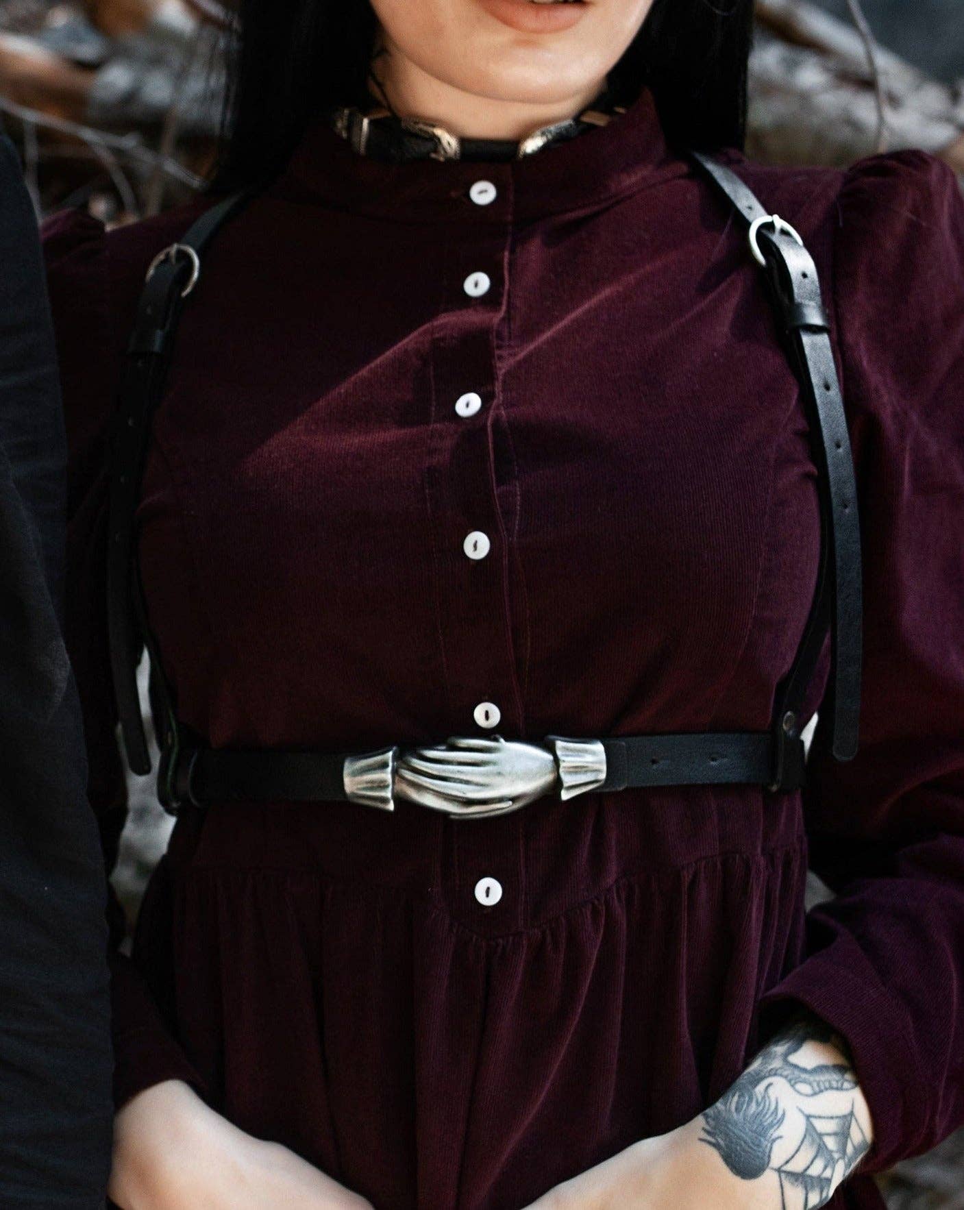The ‘Dearly Departed’ Victorian Hand Harness, an intricate hand buckled harness and a part of our Victorian Harness Series. Ft. custom design hand buckles, & dreary black vegan leather. Adjustable, to be buckled to fit you best. Updated Sizing: XS-M// 23 -35” adjustable waist. L-2X// 34” - 46” adjustable waist. Material: Vegan leather, metal buckles/hoops. Treatment: Recommended to hand wash. Created by Lively Ghosts.