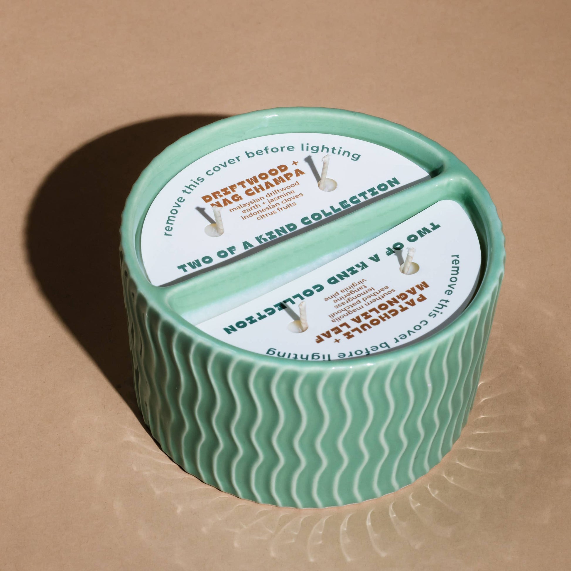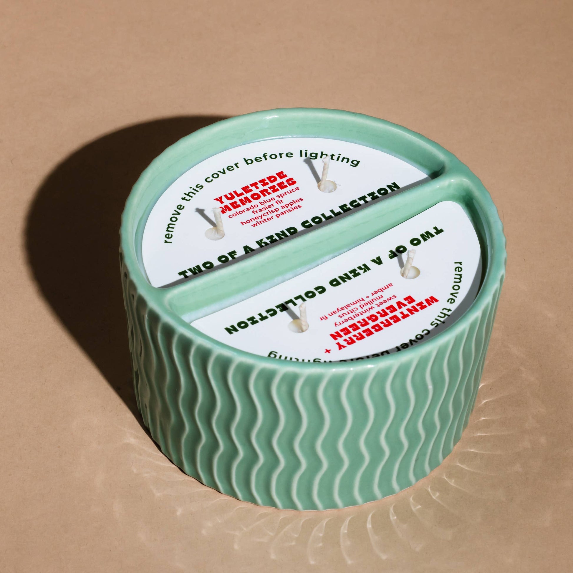Our Two of a Kind Collection: two candles that compliment one another in a custom ceramic container. We have paired our core and seasonal collection scents to be burned separately or burn both sides at once for a complimentary scent pairing.