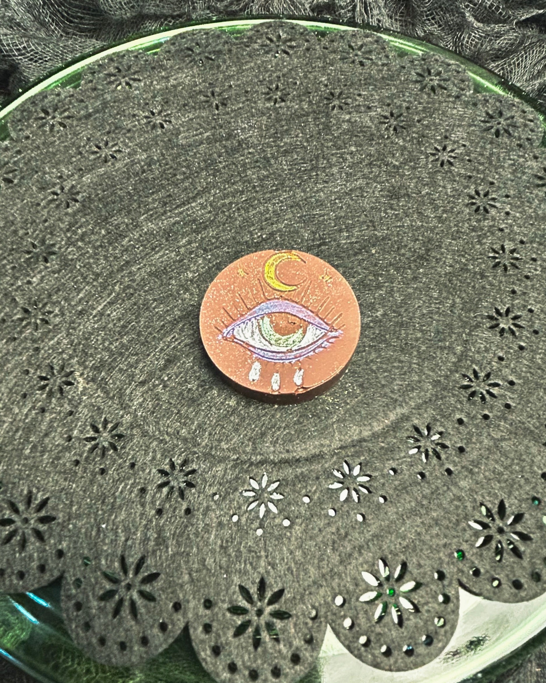 Mystic Eye chocolate medallion in classic tattoo style is made with pure Belgian couverture chocolate and individually packaged.