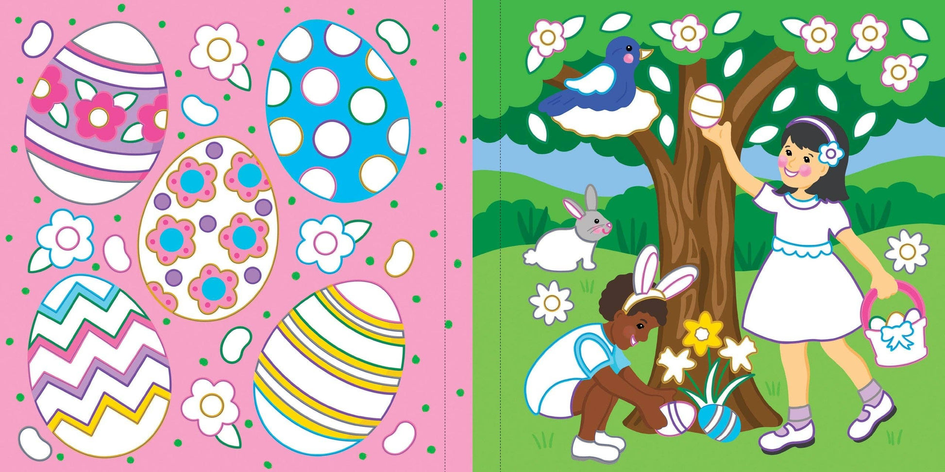 Create 10 shimmering Easter pictures with shiny holographic foil! Delightful activity book is designed especially for young children. Features 10 fun scenes to complete with the sparkly foil sheets included. Simply place foil on the sticky areas in each scene, press, and wow! Pictures include Easter bunnies, egg hunts, little lambs, chicks, and more! Picture pages are perforated for easy removal and display. 10 simple art activities are perfect for little hands. Helps develop fine motor skills through creative play. Activity book comes with 72 shiny foil sheets in 6 brilliant colors! Mess-free creative fun at home or on the go! Activity book has 10 pages plus 72 sheets of foil. Sturdy card-stock bindin