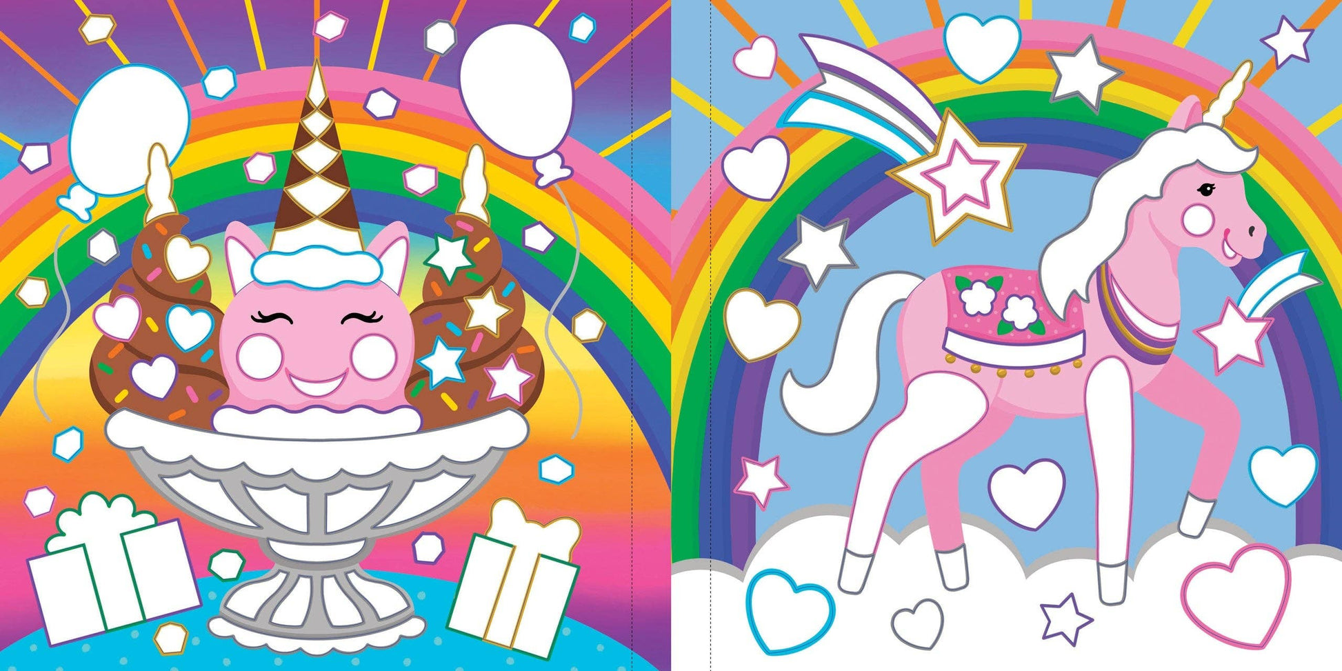 Create 10 shimmering unicorn pictures with shiny holographic foil! Delightful activity book is designed especially for young children. Features 10 fun scenes to complete with the sparkly foil sheets included. Simply place foil on the sticky areas in each scene, press, and wow! Picture pages are perforated for easy removal and display. 10 simple art activities are perfect for little hands. Helps develop fine motor skills through creative play. Activity book comes with 72 shiny foil sheets in 6 brilliant colors! Mess-free creative fun at home or on the go! Activity book has 10 pages plus 72 sheets of foil. Sturdy card-stock binding. Foil activity book measures 8-1/2'' square. Sui