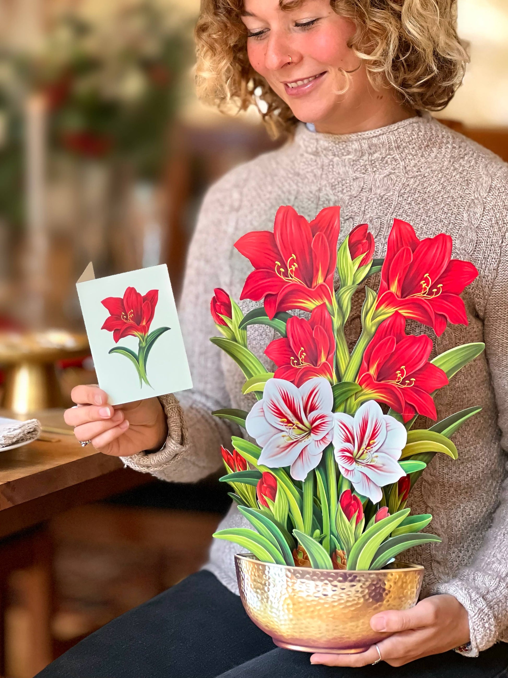Make your season merry and bright with our dazzling Scarlet Amaryllis bouquet! Standing at 16 inches tall, this captivating symphony of velvety red and candy cane striped blossoms will be the main event in any home or office. Displayed in a luxurious hammered gold bowl, your bouquet is shipped flat with a matching note card and festive envelope for gifting made easy!