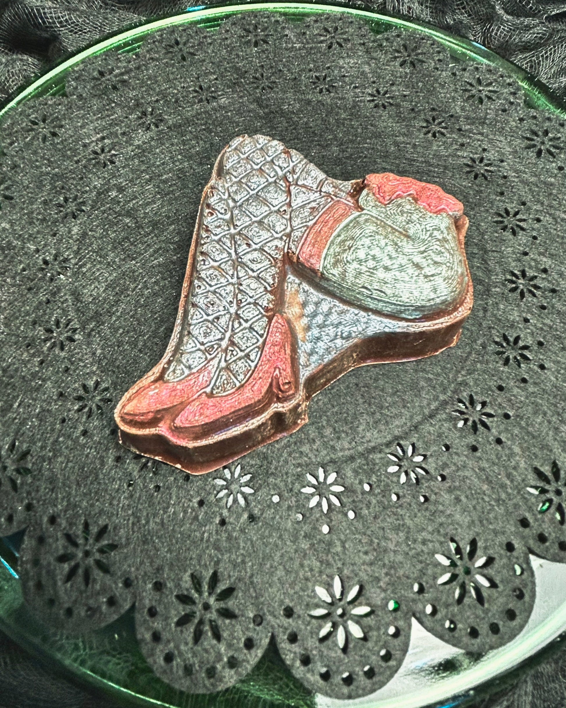 Zombie legs wearing fishnets & heels, made with pure Belgian couverture chocolate and individually packaged. Filled with delicious filling made from scratch with no artificial ingredients.