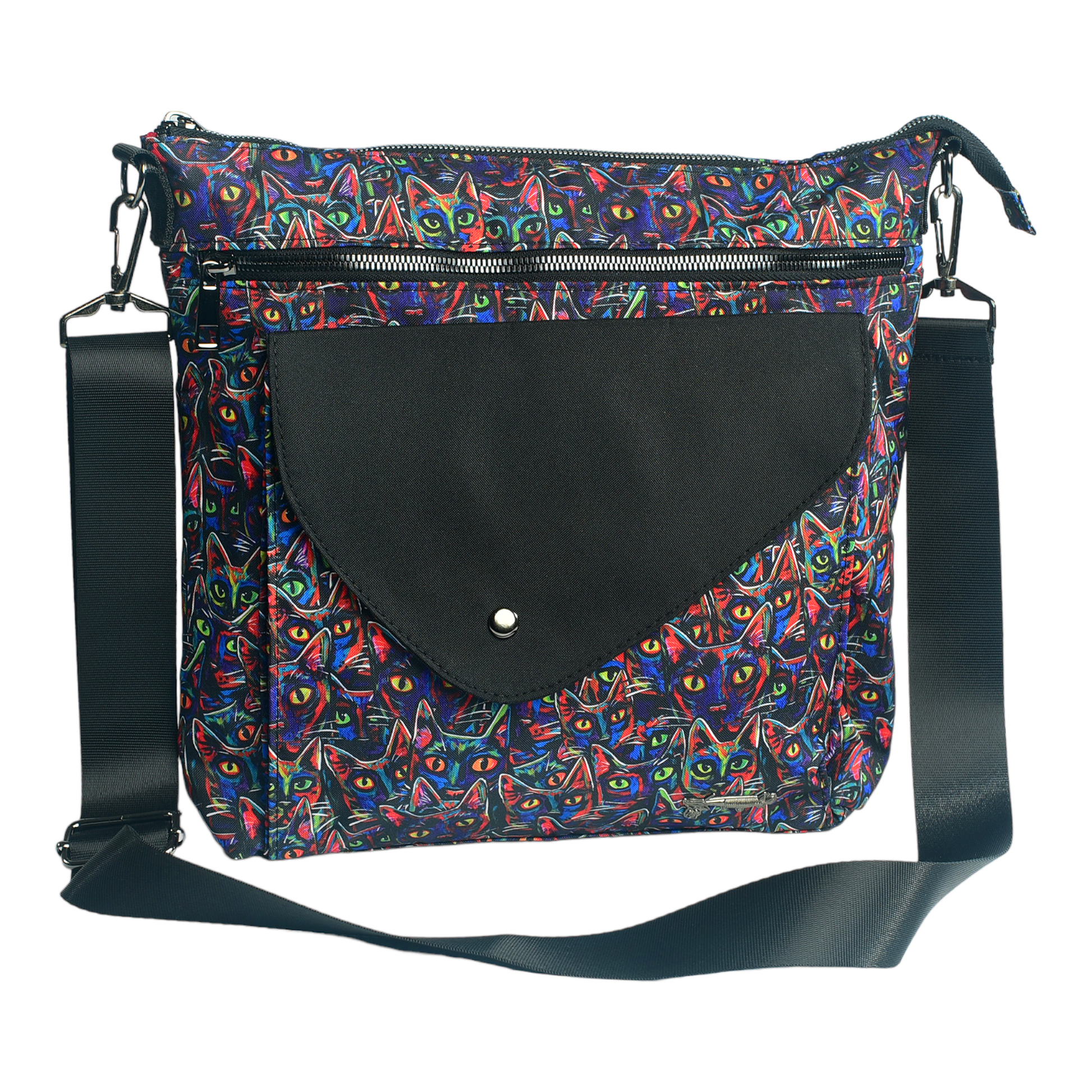 The Sidetrack Crossbody features 2 exterior zippered compartments, an interior zippered pocket, a front flap pocket with a magnetic closure and a back velcro quick pocket. You can use the back pocket to keep your phone for fast access or to stow away your shoulder strap.