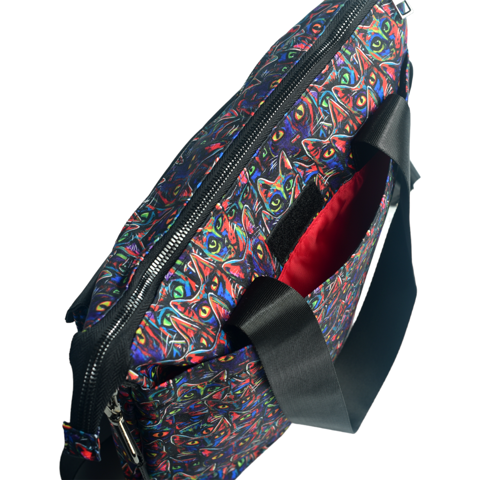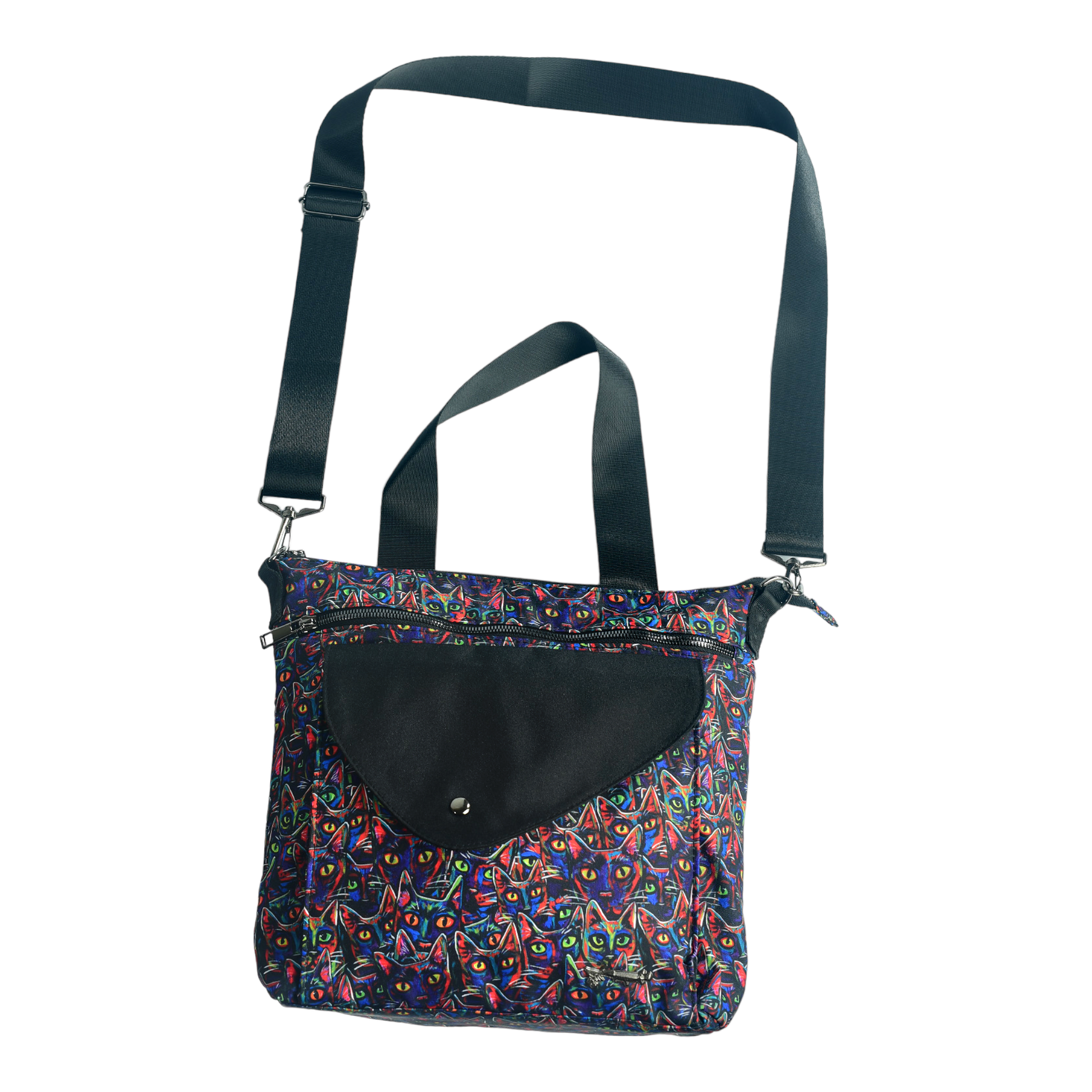 Curious colorful cats conjure creepy yet cute stare downs! This pattern is a tribute to black cats, who in many cultures are considered good luck and spiritual protectors. Black cats have the lowest adoption rates of any cats in shelters. This pattern truly showcases the many colors of these almost reflective black house panthers!