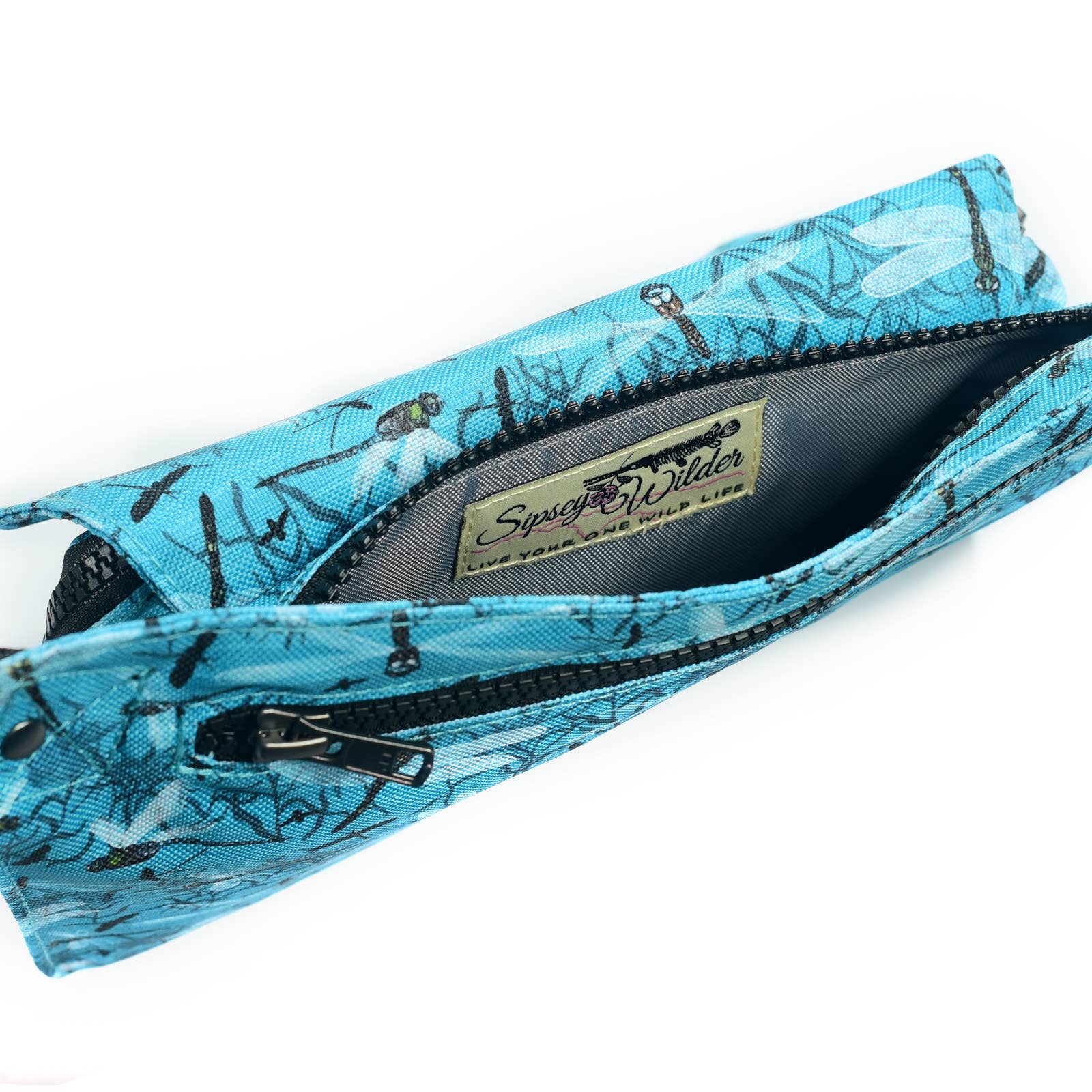 Dragonflies zip and dart in a dizzying dance to catch Mayfly snacks against an aqua blue river scene. This pattern is inspired by the Cahaba River in Alabama. People familiar with the majestic Cahaba Lily might recognize them silhouetted in the background.