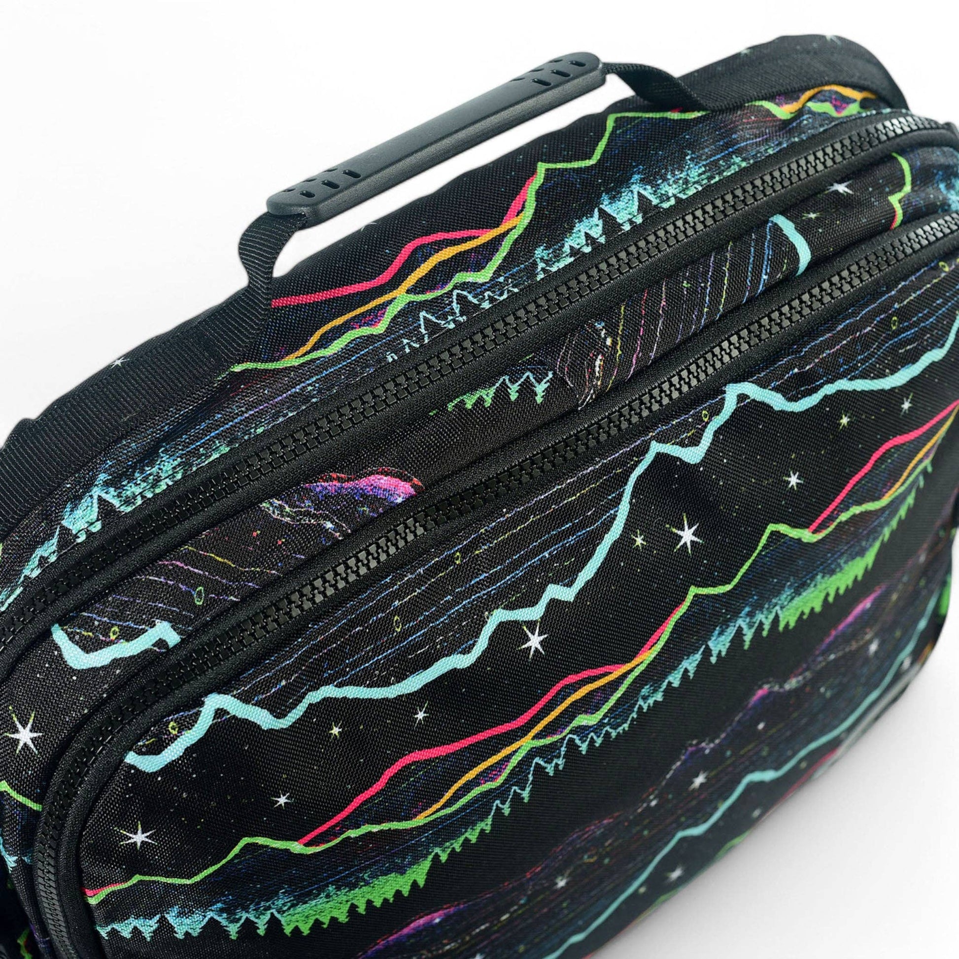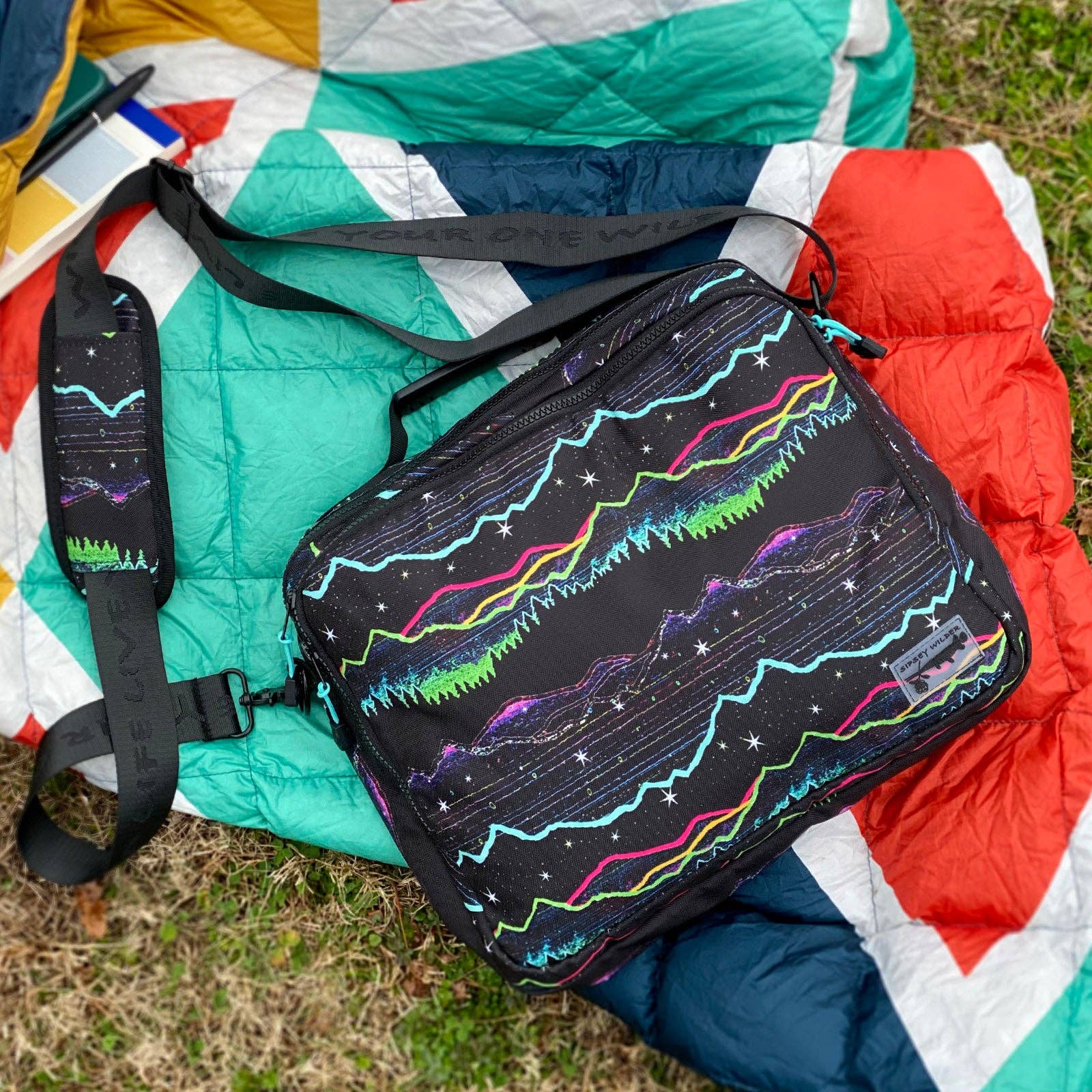 Feel the beat of your mountain heart. This lively pattern of jagged, brightly colored mountain and pine silhouettes takes you on a journey under a starry sky.