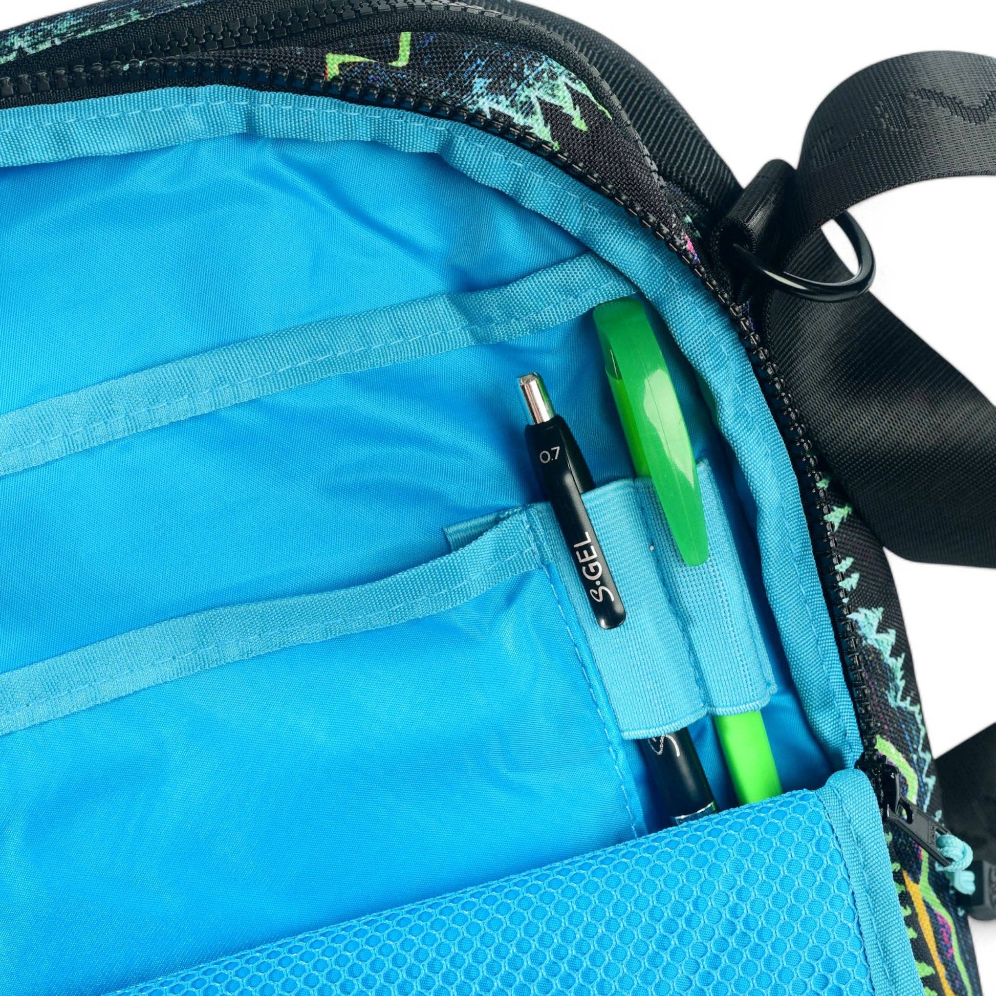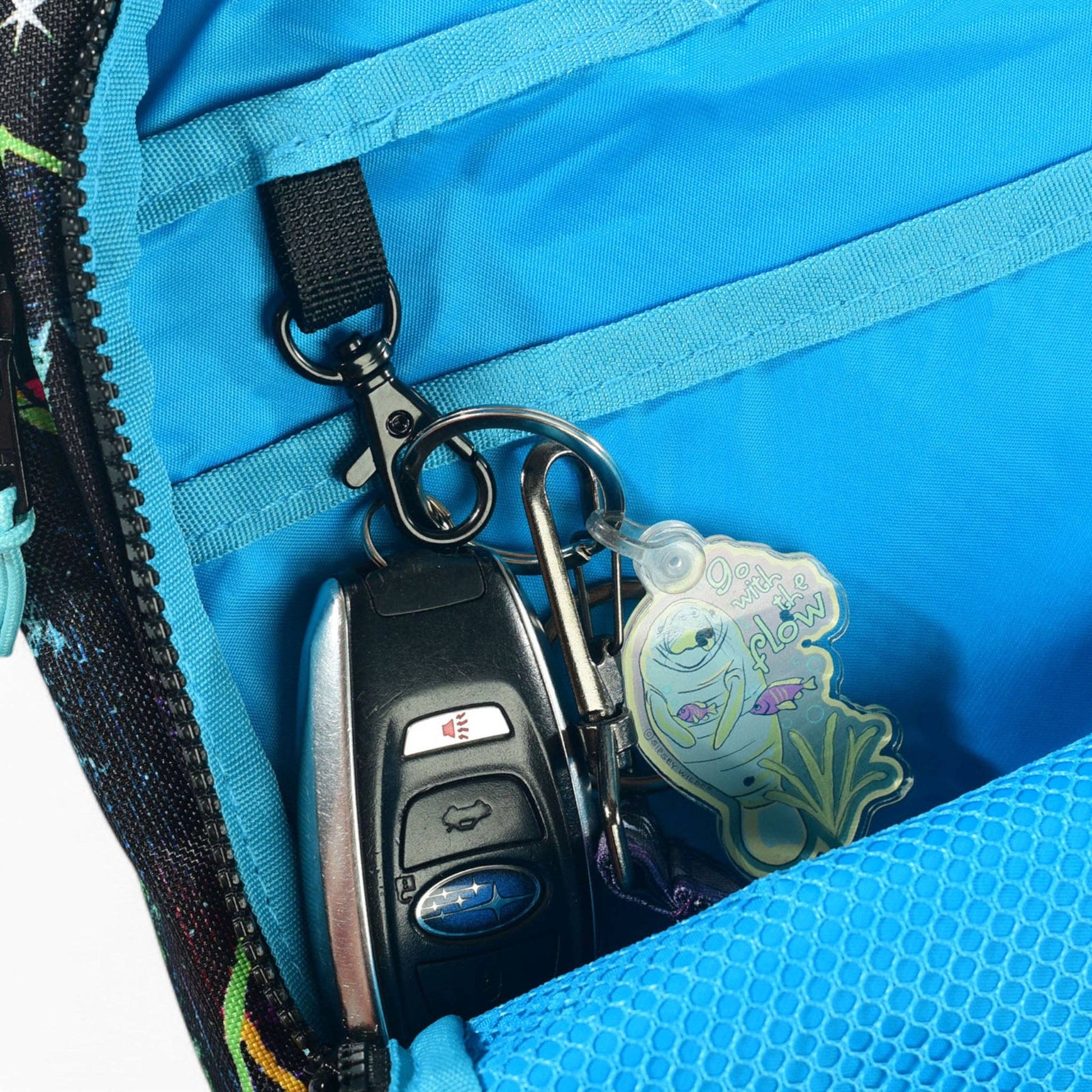 -Front pocket with 2 open pockets, a zippered mesh pocket and 2 pen slots plus a key clip.