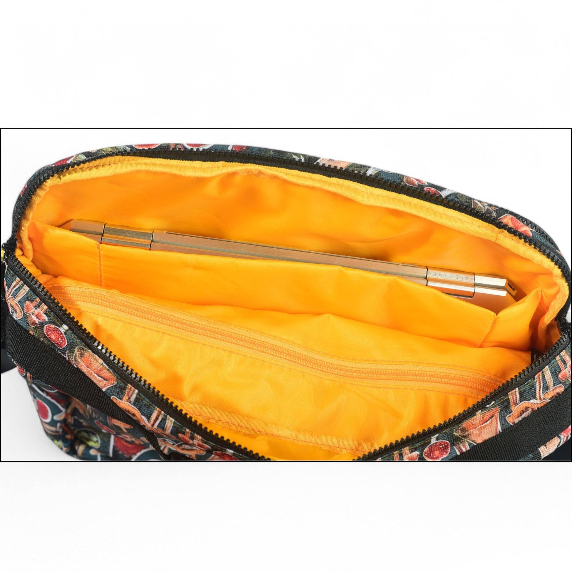 -Back zippered compartment.