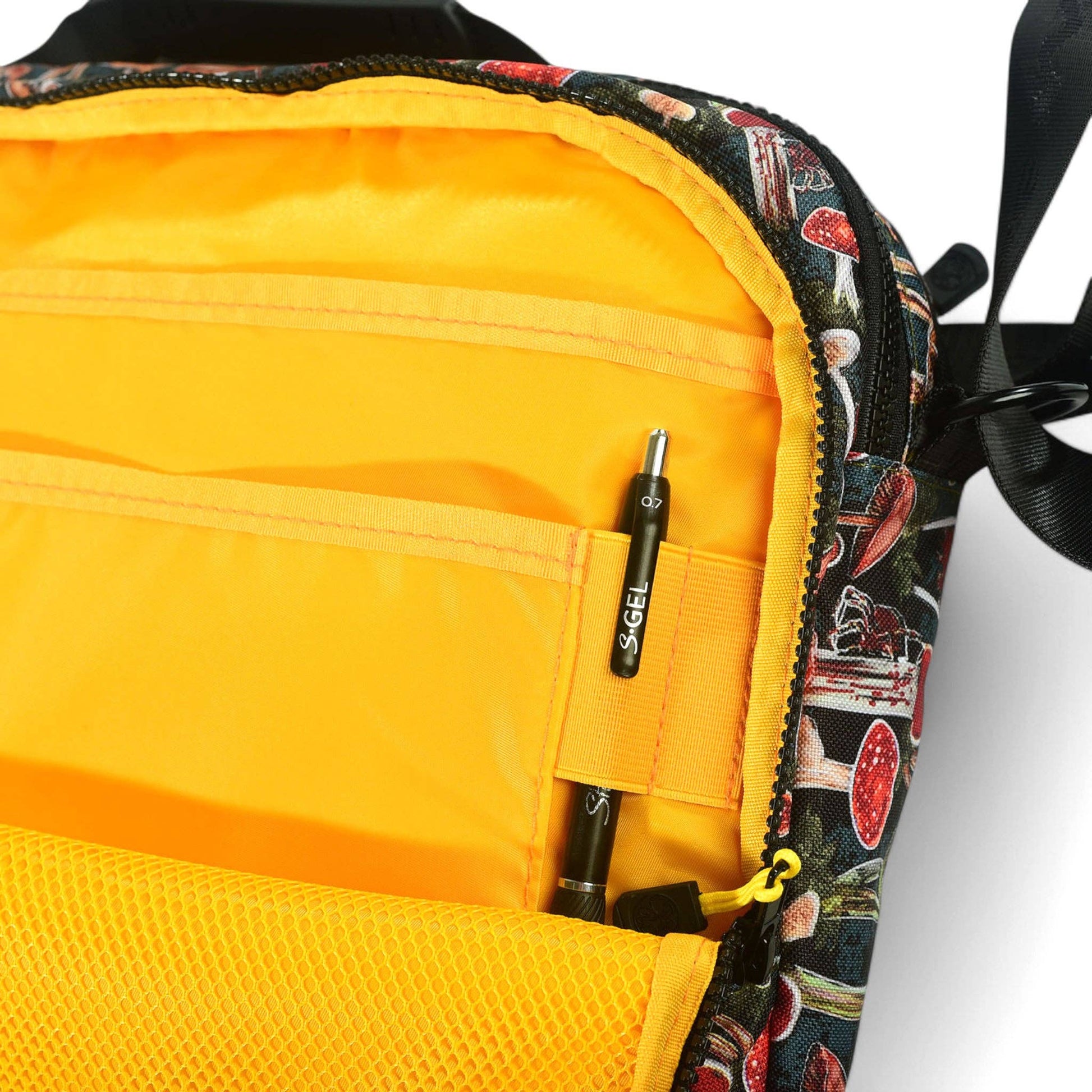 -Front pocket with 2 open pockets, a zippered mesh pocket and 2 pen slots plus a key clip.