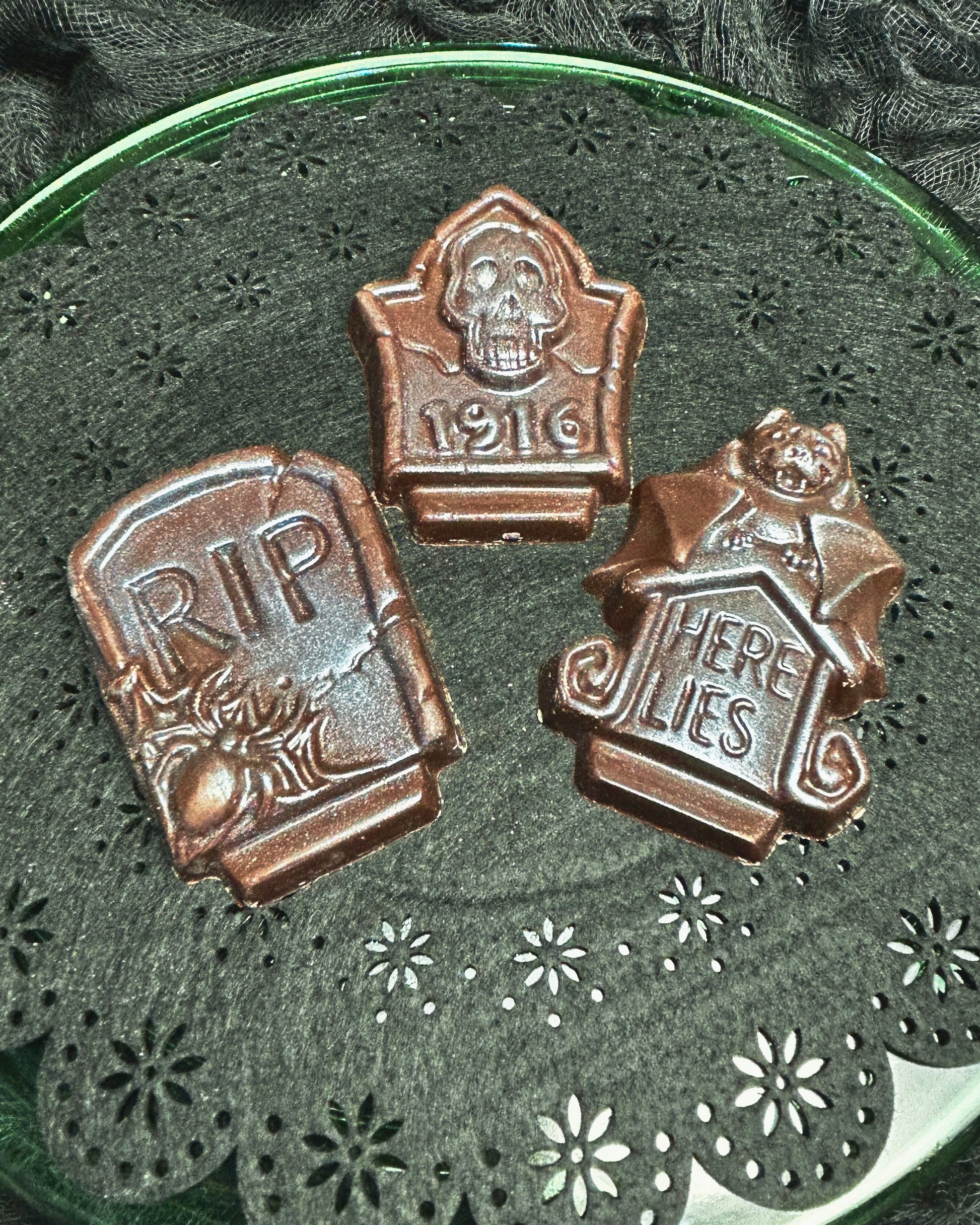 3D standing chocolate gravestones, all with different designs; made with pure Belgian couverture chocolate and packaged as a set of 3.