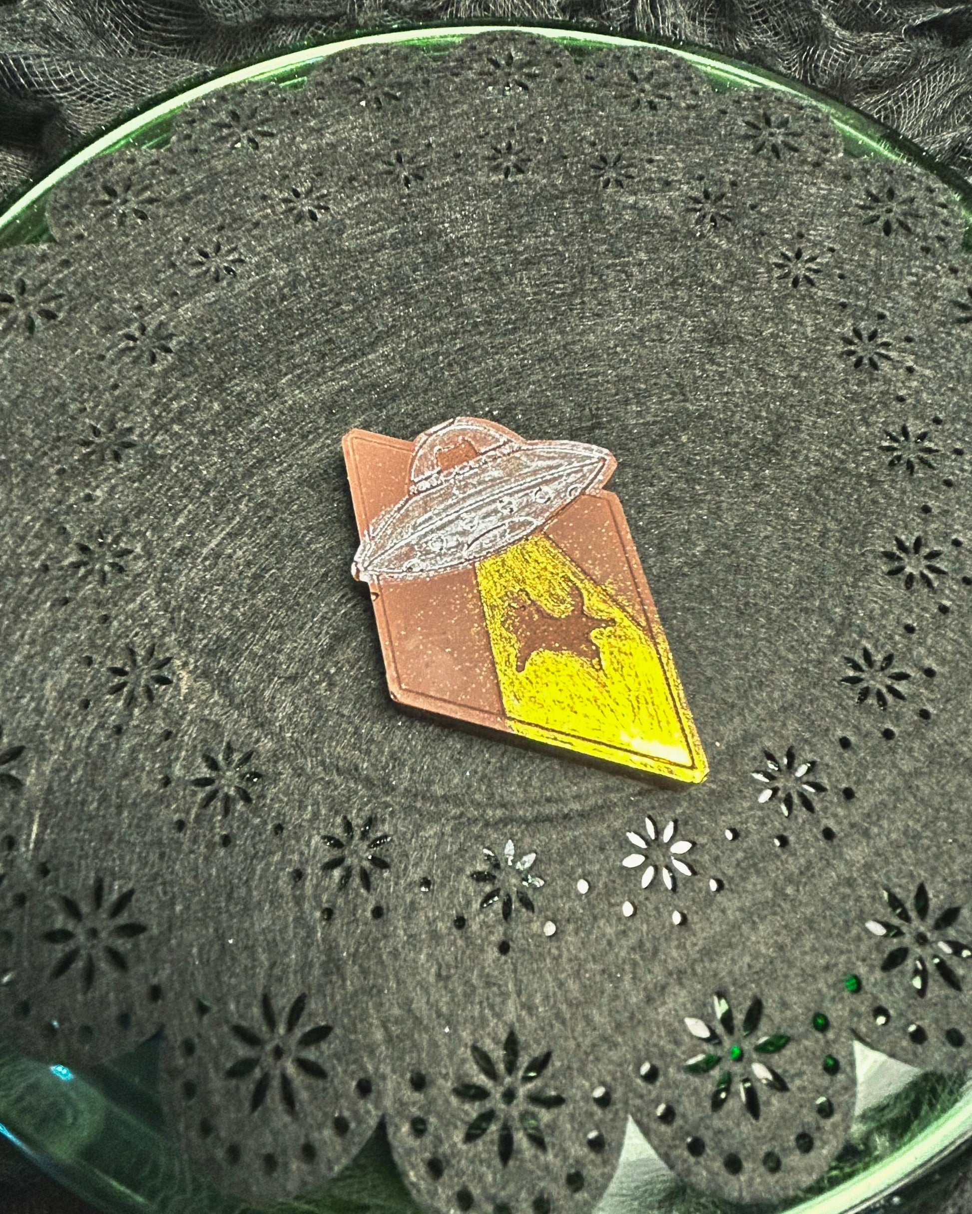 On no! A cat is being abducted by a UFO! This fun solid chocolate novelty is made with pure Belgian couverture chocolate and individually packaged.