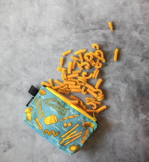 Even chefs in Michelin starred restaurants have to leave the kitchen sometime . We made this Pasta zipper bag so you never have to be far from the love of your life. Did Marco Polo bring pasta from China, achieving perhaps the greatest feat of take-out delivery the world has ever known? (He did not. Never mind.) If you love pasta in its many forms, this is not only the perfect pouch, it’s also a great source of baby names. (Strozzapreti if it’s a girl. Penne if it’s a boy.) Say, isn’t time you got back to the kitchen? Some of us are hungry!